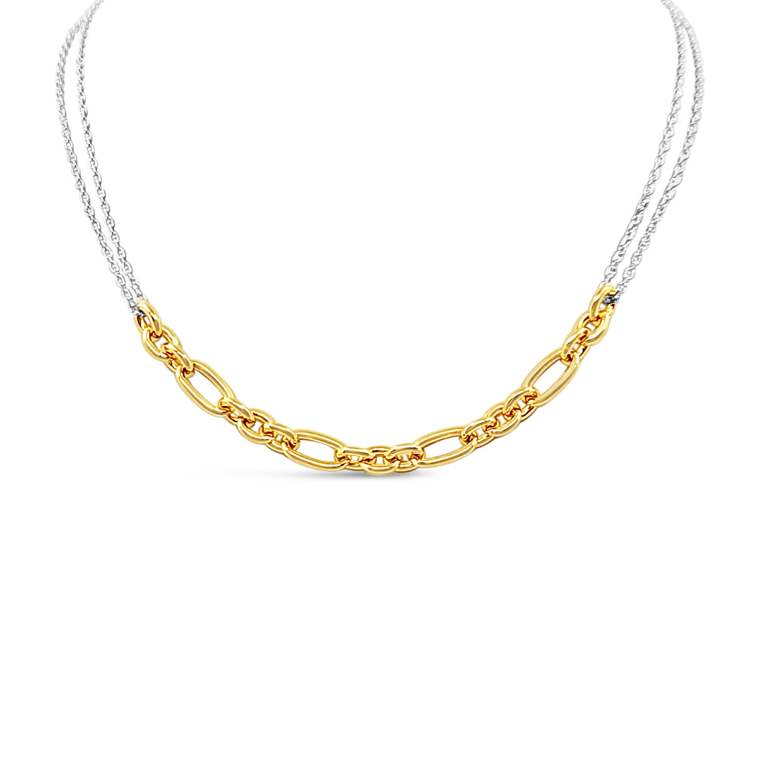 Enhance any outfit with our luxurious Fancy 2 tone necklace! This stunning accessory features a unique 2 tone design, adding a touch of sophistication and elegance to your look. Whether for yourself or as a gift, our necklace is sure to impress and make a statement. Don't miss out on this must-have piece!