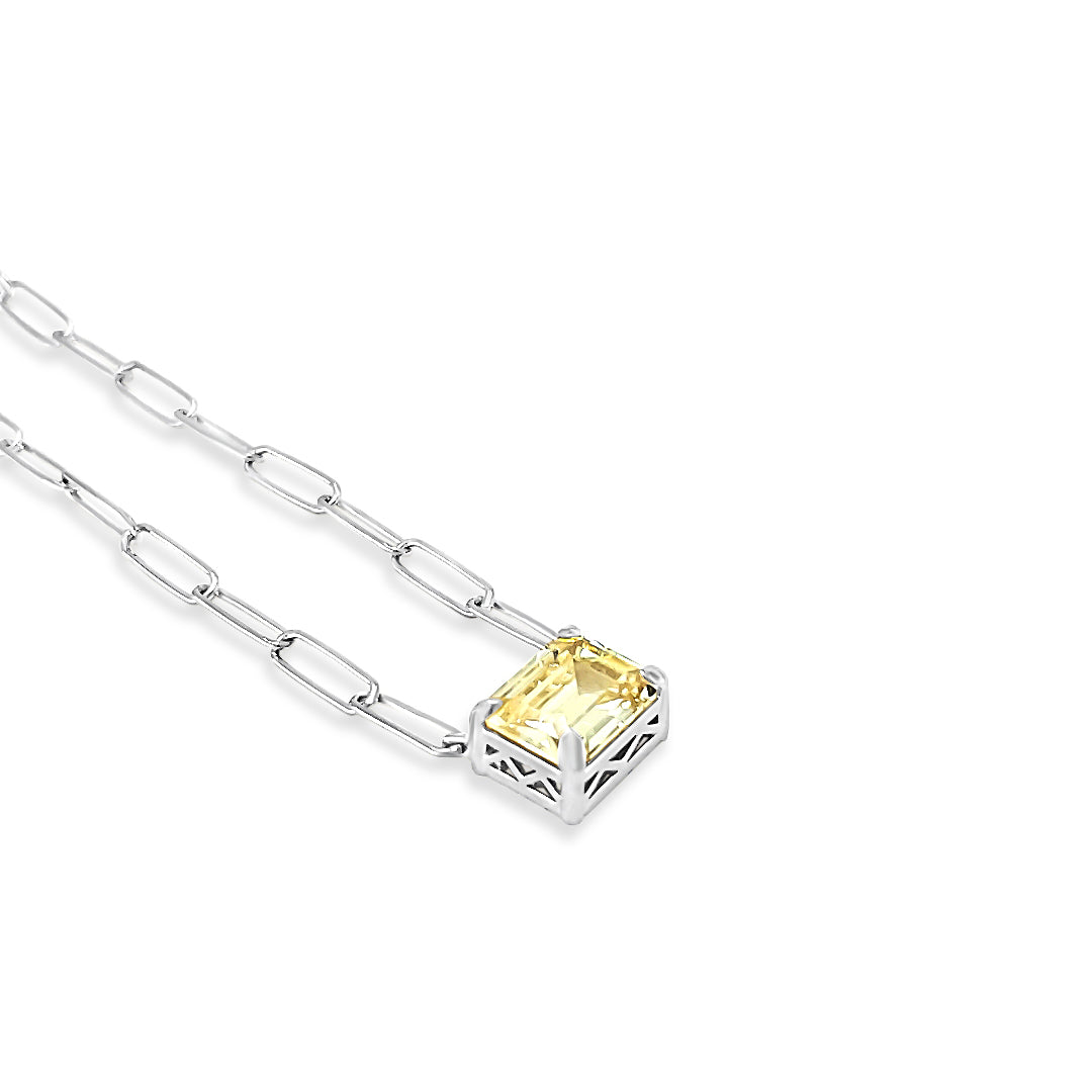 The sleek paperclip links create a bold yet refined look, while the radiant Canary cubic zirconia pendant, measuring 11 x 9 mm, is beautifully encased in an open, architectural setting that enhances its brilliance from every angle.