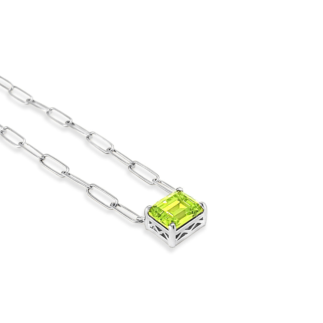 The sleek paperclip links create a bold yet refined look, while the radiant Apple Green cubic zirconia pendant, measuring 11 x 9 mm, is beautifully encased in an open, architectural setting that enhances its brilliance from every angle.